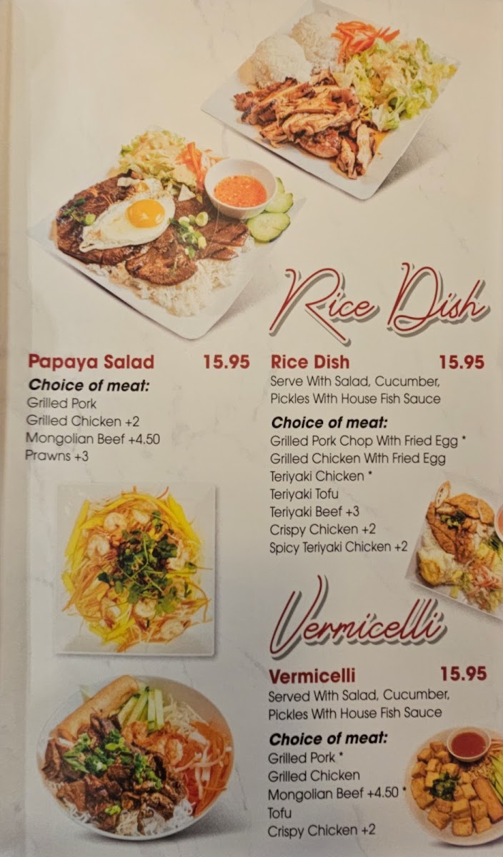 True to its name, the pho at Hello Pho stands out, offering a rich and authentic broth that has earned praise from local pho connoisseurs. Construct your perfect bowl with tender meats—whether it's the beef or chicken, both generously portioned, or opt for a rice dish like the COM Grilled Chicken with Fried Egg for a hearty plate that's comforting and satisfying. Vegetarian options, such as the Teriyaki Tofu, are available, ensuring there’s something for everyone.